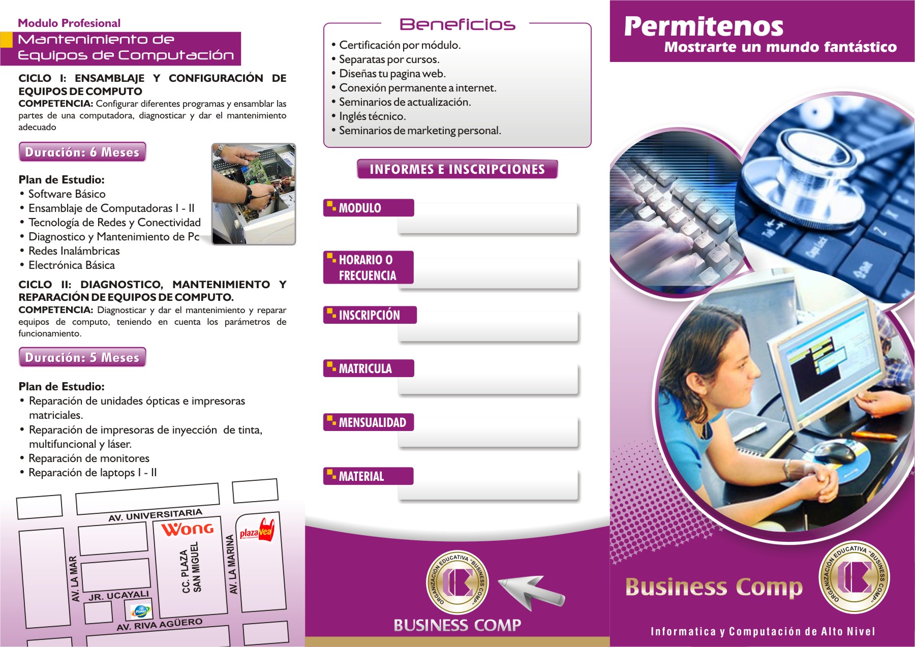 "Business Comp", es una Organización Educativa, que brinda una educación técnica productiva de calidad, donde formamos profesionale técnicos emprededores, innovadores y con valores que contribuyen al desarrollo social de nuestro país.